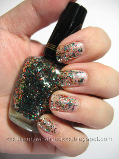 I bought this glitter polish a couple weeks ago. I think the name of it suits it pretty well because when I looked at it, it did remind me of gems. The base color is clear and you have different size and shape of glitters. They are blue, orange-red, silver, gold, and green. There is quite plenty of glitters so you get a pretty decent coverage with 2 coats. If you want to completely cover your nails with the glitters you will need at least 3 - 4 coats, if not more depending on how you layer it. I tried it as a top coat with other colors as base and I'm not too crazy about it. Perhaps I'll like it more if I completely cover my nails with it but that would be glitter explosion on my nails. I think it will work best on just one or two accent nails.