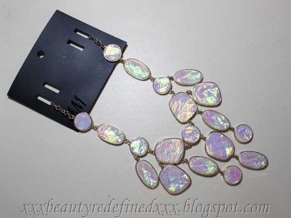 The first piece is a white/pink multichromatic statement necklace. It's so pretty, I knew I had to bring this one home the minute I saw it. It imitates the color of a seashell and depending on how the lights hits it, it reflects green and orange colors. It has a pretty good weight and quality feel to it. $19.95 from H&M.